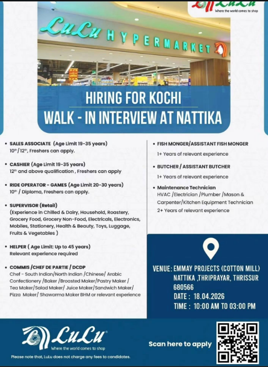 ലുലു ഹൈപ്പർ മാർക്കറ്റിൽ ജോലി അന്വേഷിക്കുന്നവർക്ക് ഇതാ അവസരം വന്നിരിക്കുന്നു. നിരവധി തസ്തികകളിൽ ഉടനെ അപേക്ഷിക്കാം ഇന്റർവ്യൂ ജോലി നേടാം. Lulu ഹൈപ്പർമാർക്കറ്റ് കൊച്ചിയിലെ പുതിയ സ്റ്റോറിനായി വിവിധ തസ്തികളിലേക്ക് നേരിട്ടുള്ള അഭിമുഖം (Walk-in Interview)സംഘടിപ്പിക്കുന്നു. തൃശ്ശൂർ ജില്ലയിലെ Nattika യിലാണ് ഇന്റർവ്യൂ നടക്കുന്നത്. റീട്ടെയിൽ മേഖലയിൽ കരിയർ തുടങ്ങാനോ മുന്നേറാനോ ആഗ്രഹിക്കുന്നവർക്ക് ഇതാണ് സുവർണ്ണാവസരം.