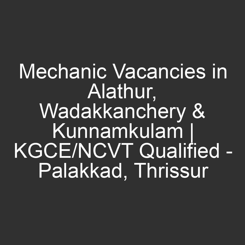 All Jobs, Kerala Jobs, Palakkad, Thrissur JobsMarch 13, 2026Mechanic Vacancies in Alathur, Wadakkanchery & Kunnamkulam | KGCE/NCVT Qualified – Palakkad, Thrissur