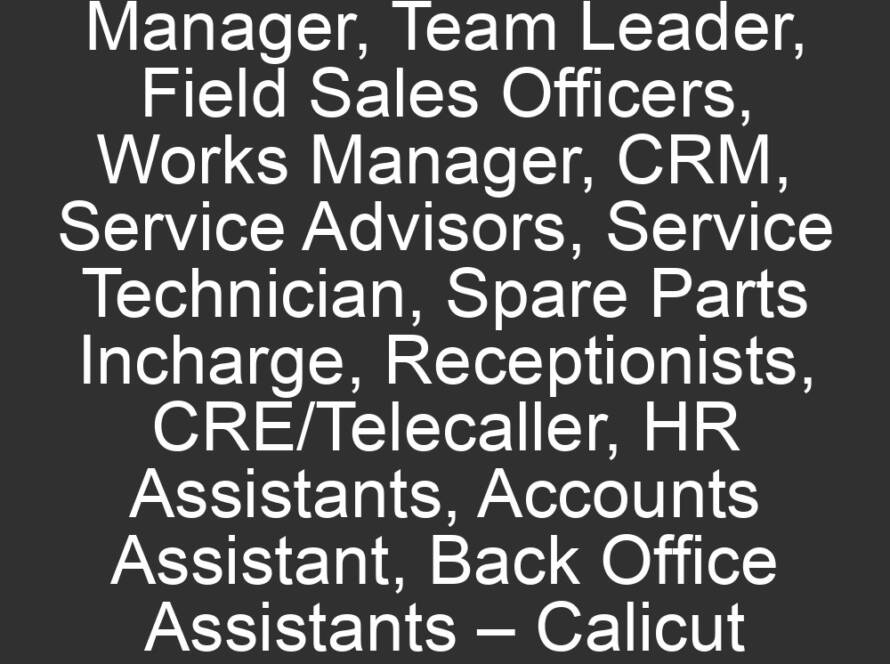 All Jobs3 days agoSales Manager, Branch Manager, Team Leader, Field Sales Officers, Works Manager, CRM, Service Advisors, Service Technician, Spare Parts Incharge, Receptionists, CRE/Telecaller, HR Assistants, Accounts Assistant, Back Office Assistants – Calicut | JOBBERY.IN