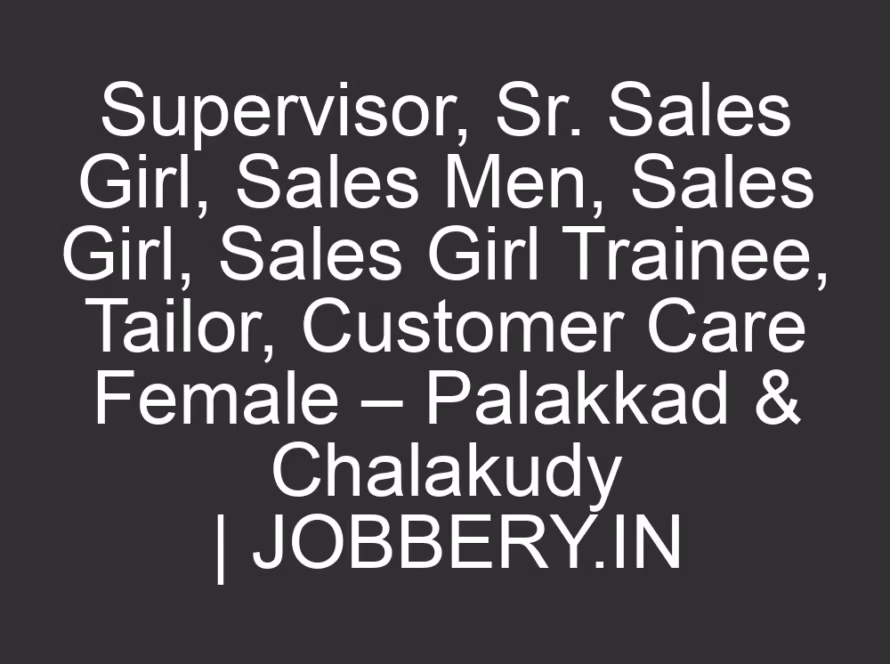 All JobsMarch 7, 2026Supervisor, Sr. Sales Girl, Sales Men, Sales Girl, Sales Girl Trainee, Tailor, Customer Care Female – Palakkad & Chalakudy | JOBBERY.IN
